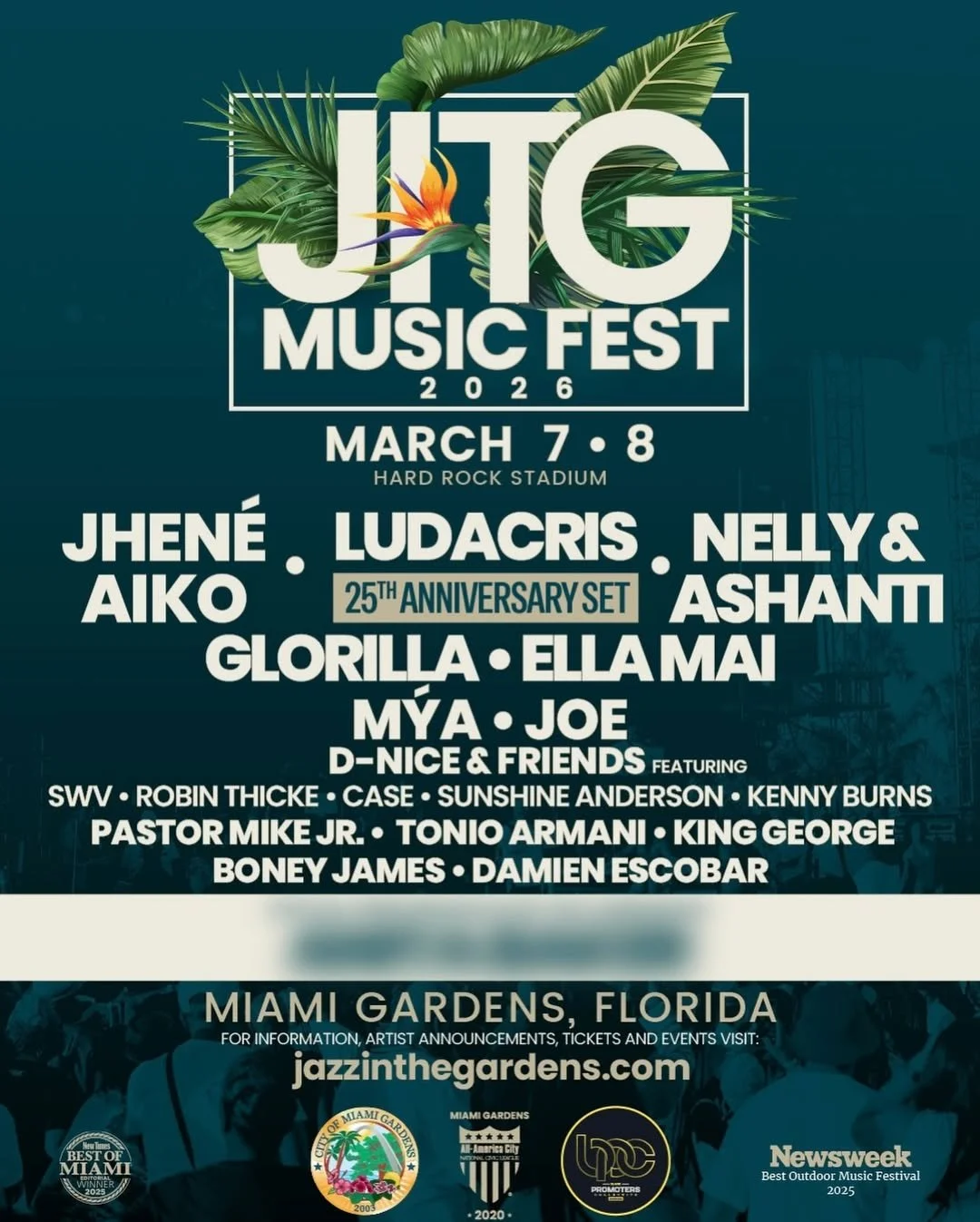 Back to All Events Jazz in the Gardens Music Fest - Miami Gardens, FL Saturday, March 7, 2026 12:00 PM Sunday, March 8, 2026 11:00 PM Hard Rock Stadium 347 Don Shula Drive Miami Gardens, FL, 33056 United States (map) Google Calendar ICS tickets